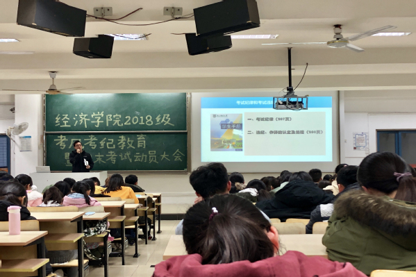 接下来,王珏老师向大家简述了本次年级大会的五项议程,分别为辅导员面对面测评、本学期工作回顾总结、考风考纪教育、后期工作安排和期末考试动员。