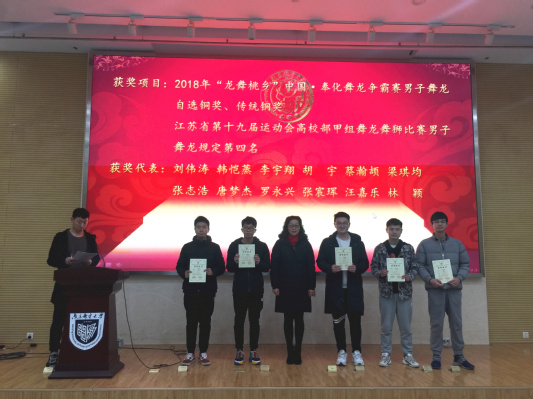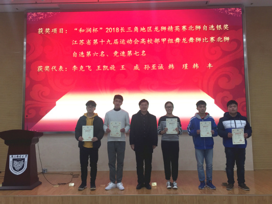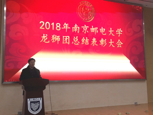 2018年12月21日12:15,SJB世俱杯官方网站大学生龙狮团2018年总结表彰会在仙林校区学科楼报告厅隆重举行。校团委李晓华书记,校体育部党总支杨玲书记,SJB世俱杯官方网站党委张强书记,SJB世俱杯官方网站党委董军副书记,校体育部刘晶晶老师,SJB世俱杯官方网站分团委书记王欢老师,SJB世俱杯官方网站2018级辅导员王珏老师,以及龙狮团全体成员出席了大会。此次活动由龙狮团负责人刘伟涛同学主持。
