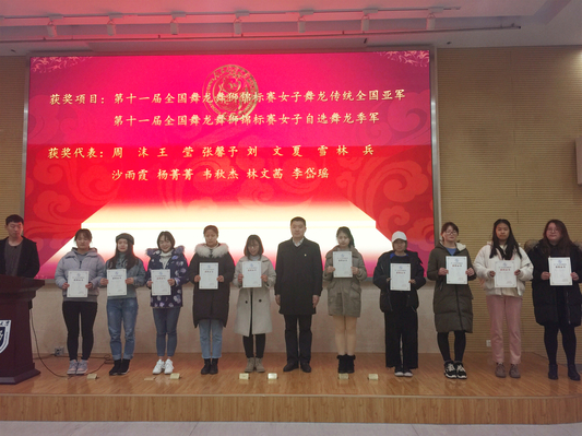 随后共同观看了各支队伍的宣传视频,男龙队、女龙队、狮队、鼓队和荷花龙队的负责人依次上台发言,对一年以来的工作进行总结并介绍新一年的训练计划。出席总结表彰会的嘉宾为这些积极参加校内外演出和在比赛中获奖的同学颁发证书。