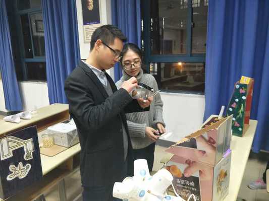 比赛正式开始前,主持人宣布比赛规则及比赛过程中的注意事项,各小组按照签到顺序展示了自己精心制作的作品及PPT,并与评委进行现场交流。作品中不乏集实用性与观赏性于一体的各类精致收纳盒,有趣又多功能的存钱罐,便携迷你的防盗神器等包含多种物理化学原理的制作,最终由分团委书记王欢老师与其他学生评委共同选出一二三等奖以及优秀作品。
