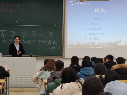 2019年3月8日晚,SJB世俱杯官方网站在教3-204教室顺利举办了SJB世俱杯官方网站第三十四期大学生菁英人才学校暨SJB世俱杯官方网站骨干培训班第二课。本次课程由SJB世俱杯官方网站分团委书记兼2017级辅导员王欢老师主讲,就《大型活动的组织与实施》这一主题展开授课,意在培养学生的组织能力和提升其处理活动细节的水平。
