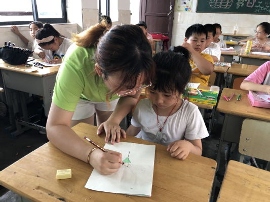 一天的课程安排永远是慢慢当当却也收获累累的。书法班方面,志愿者在第一天进行书法发展及其脉络介绍后,根据听课学生已有知识的差异,将一、二年级学生分为两个班,进行不同计划的分层教学。对于一年级的教学,志愿者把重点放在了汉字书写的基本功方面,以“横竖撇捺点”的基本笔划配合相对应的例字,强化孩子们对于基本功的掌握程度,为其后面的书法学习打下良好基础。二年级则更加侧重于汉字间架结构的教学。志愿者通过讲解不同偏旁结构,教会孩子们看字、识字、审字的要点,以“给偏旁写生字”的方式,教会孩子们如何在实际书写中更好运用这些技巧,做到举一反三。绘画班方面,志愿者通过理论知识讲授和实践能力教学相结合,更好地向孩子们进行绘画知识的普及。上午的教学课主要针对绘画的起源、发展、现有类别三个角度出发,对孩子们进行了理论知识的讲解,加强了其对绘画的深入了解。下午则偏向于实践练习。志愿者通过实物投影,以画一笔教一笔的方式向孩子进行绘画技巧的讲授,从轮廓构架到颜色处理,细致入微,耐心投入,这样的教学方式受到了孩子们的认可,以饱满的热情度过了下午三堂绘画课。声乐班方面依旧活力十足,精气神慢慢。志愿者们没进教室之前,声乐班的孩子已然整齐站立好,静候志愿者的到来。在带领孩子进行发声练习后,志愿者根据每位孩子的音调音色进行了高低声部的划分。与孩子们进行商量后决定,以《我和我的祖国》这首歌进行合唱训练,在练习中对孩子们进行声乐和歌唱知识的教学。分声部的练习反复进行、要求严格,但过程中没有一个孩子因畏难或枯燥选择放弃。他们的满腔热忱不断激发着志愿者的教学热情,志愿者更加专注地投入教学之中,希望用自己的知识帮助这些孩子更好地学习声乐知识、更好地爱上声乐文化。