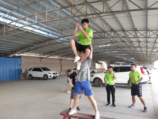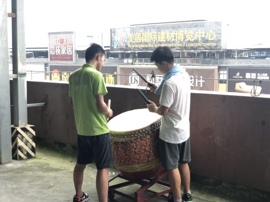 814日,队员们轮流拿着狮头复习了前面所学的群狮套路和非常考验狮头狮尾配合的大跳飞跃。经过几天的学习,大家的技艺熟练了许多,手和脚的配合也更加灵活,对于师傅的夸奖,队员们由衷的感到高兴与自豪。在练习“上凳采青”套路的前半段时,队员们充分发挥自身的舞狮技艺与想象力,通过自编上凳前的小套路,突破舞狮固定套路,取得了不俗的表现。