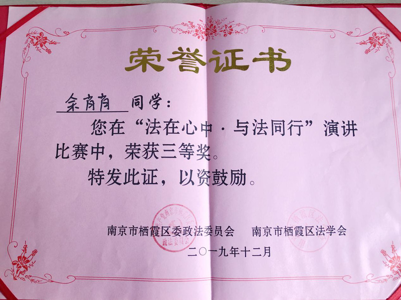 2019年12月4日,由栖霞区委政法委、区法学会、区司法局和团区委共同举办的“法在心中·与法同行”演讲比赛在栖霞区党校进行。南京市委政法委副书记、市法学会副会长鲍陈,栖霞区委常委、政法委书记秦志刚出席此次活动。区委政法委、区司法局、团区委相关领导,区各部门分管领导,各街道综治主任,各司法所长,区法学会各研究会会长,参赛高校学生代表约180人参与此次活动。来自南京大学、南京师范大学、SJB世俱杯官方网站、南京财经大学、南京森林警察学院5所院校共13名选手经过层层选拔,进入到最后的现场竞演环节。比赛中,参赛选手围绕“法在心中·与法同行”这一主题展开演说。经过近两个小时的激烈角逐,最终SJB官网19级应用经济学研究生余肖肖在众多法学专业的选手中脱颖而出,荣获三等奖的好成绩,展现了经院研究生拼搏向上的风采。