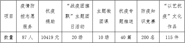 SJB世俱杯官方网站分团委向全院学生发出“疫情防控,人人有责”倡议,共计87名学生参与到线上线下的疫情防控志愿服务中,其中2019级季星辰同学家庭祖孙三代齐上阵,传递了榜样的力量,受到中国江苏网报道。全院学生疫情捐助共计10419元,用点滴力量担起青年使命。组织宣传约20场“战疫团旗飘”主题团日活动,发布抗疫专题推送40余篇,宣传抗疫典型事迹,讲述一线抗疫故事。开展10期“爱在疫情蔓延时”主题微团课,“战疫到底”防疫知识竞赛吸引约200名学生参与,引导进行科学防疫。“以艺抗疫”文化作品征集活动收到了微视频、海报、绘画、书法、征文、诗歌、词云图、H5等形式多样的文艺作品共计115件,展现打赢疫情防控阻击战的必胜信念,用实际行动弘扬青春正能量。