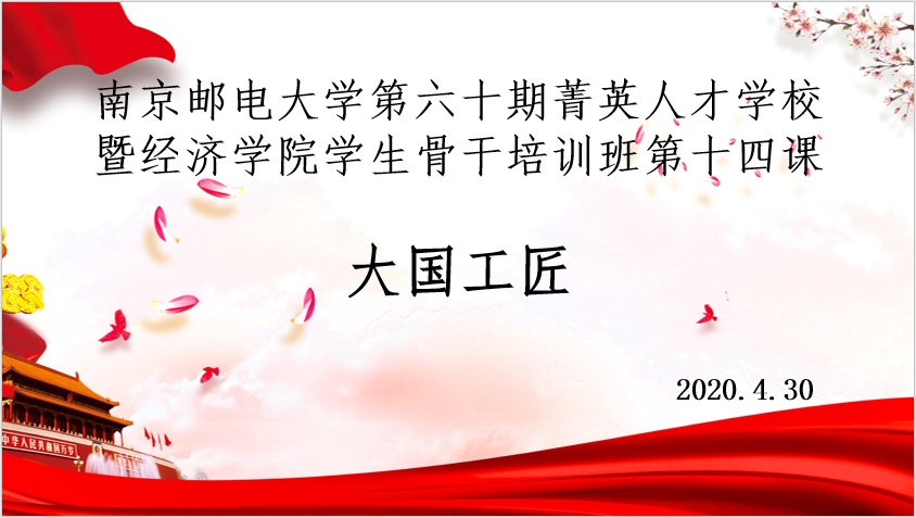 2020年4月30日,SJB世俱杯官方网站第六十期菁英人才学校暨SJB世俱杯官方网站学生骨干培训班第十四课在线上顺利举行,本次课程主要内容为观看和学习科技文化教育片——《大国工匠》。