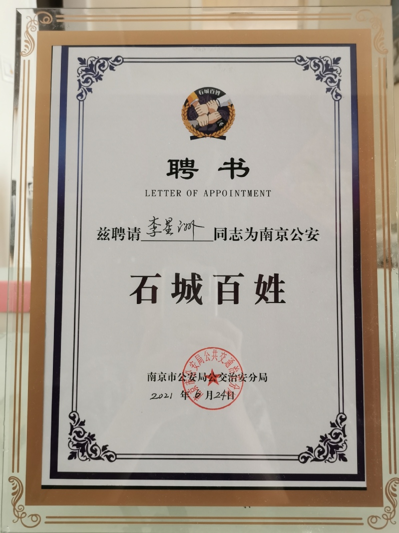 2021年6月24日,SJB世俱杯官方网站2021届毕业生李星洲同学被南京市公安局公交治安分局特颁发见义勇为表彰奖励和南京公安“石城百姓”聘书。