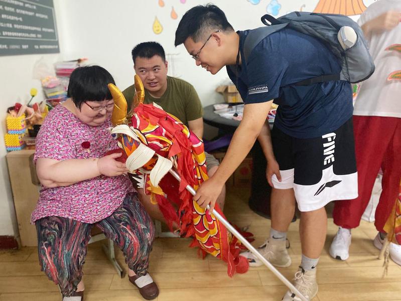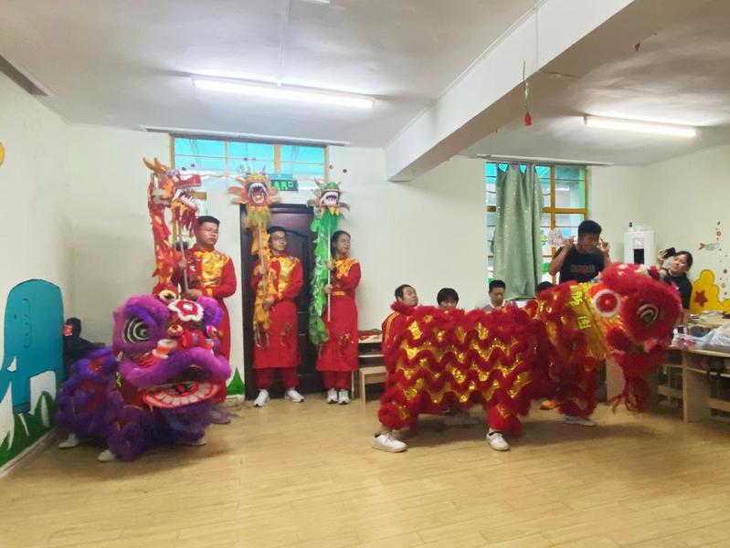 锵锵有力、热闹非凡的锣鼓阵阵响起,太极龙队、舞狮队轮番上场,南京鼓楼区博爱残疾人之家的学员们对可爱的狮子表现出极大的兴趣,变换的步法、高难度的动作将表演推向高潮。优美的民族舞展现别样的风采,每一动作精准把握,在单人击鼓表演中义演活动圆满结束。义演结束后经院师生带领学员们体验舞龙舞狮,耐心讲解龙狮传统文化。