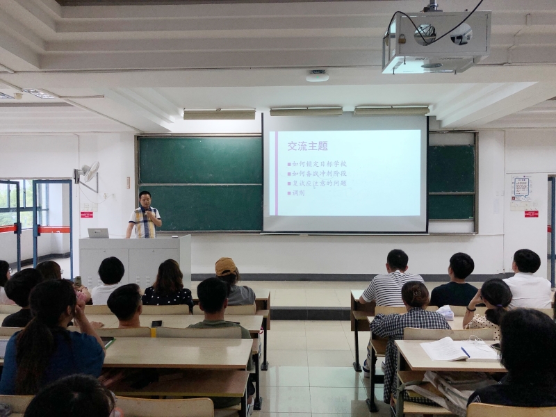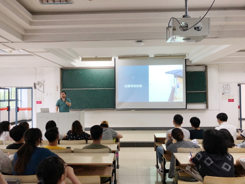 本次大会分为三个部分。首先,校研究生招生办公室主任王霁讲话。王霁老师向同学们介绍了当前全国大致的考研形势及研究生招生的基本流程,以本校为例,介绍了院校选择、复习策略等注意事项,鼓励大家积极报考我校研究生。