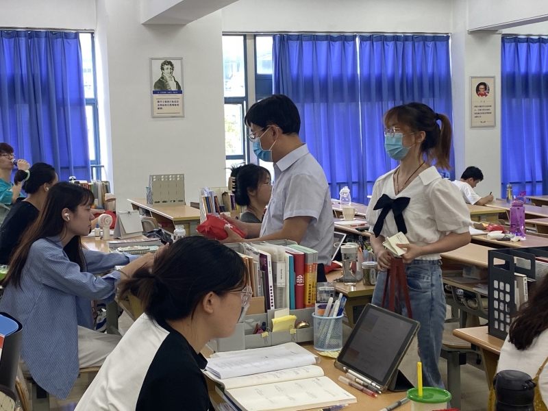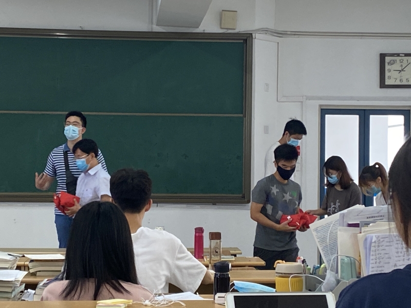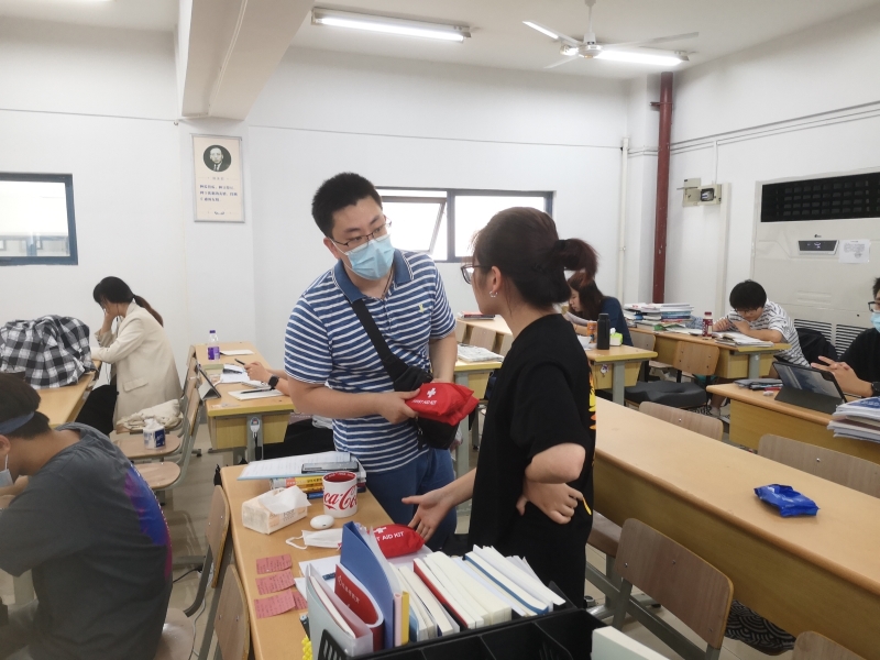 董军副书记和王珏老师第一站首先来到考研教室教4—401,为学院考研学生送上防疫礼包,与正在积极备考的同学们进行了亲切的交谈,详细询问了同学们的备考情况,鼓励考研学子们要坚定信念,放松心态,克服疫情和酷暑诸多苦难,努力拼搏,持之以恒,希望同学们通过考研提升自我,并预祝大家心想事成。