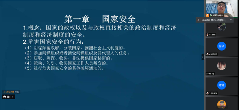黄海生老师首先从国家安全出发,说明了国家安全的概念及其重要性,强调“国家安全人人有责”,并通过问答互动,普及了宗教安全相关知识。随后,黄老师主要从预防暴力恐怖犯罪、抵制邪教、远离传销、拒绝黄赌毒、注意交通安全、杜绝校园暴力等方面提醒同学们注意人身安全,时刻保持警惕,提高自我防护意识,并向大家展示了遇到暴力袭击的自救方式。最后,黄老师结合众多案例,向同学们强调了财产安全的重要性,进一步让大家了解反诈的基本知识、处置方式和诈骗带来的巨大危害。