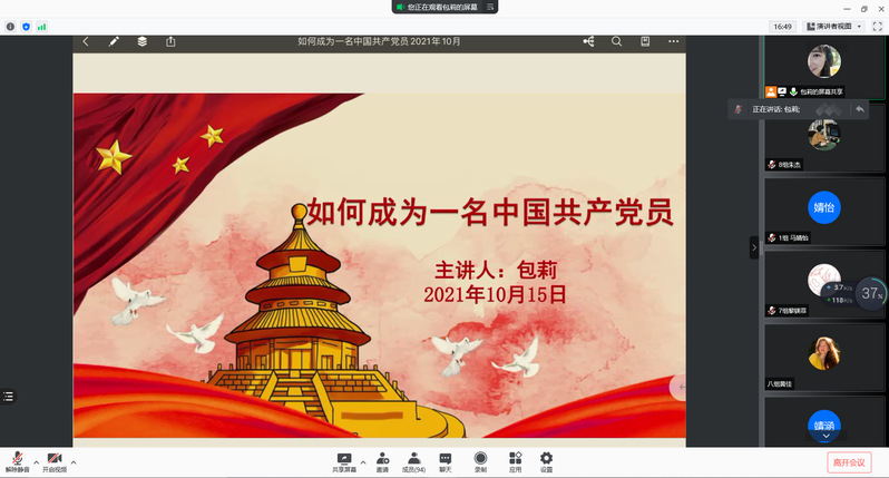 2021年10月15日晚,SJB世俱杯官方网站第八十六期大学生菁英人才学校暨SJB世俱杯官方网站学生骨干培训班第十课在线上顺利举行。此次课程的主讲人为SJB世俱杯官方网站组织干事包莉老师,具体围绕《如何成为一名中国共产党党员》这一主题展开授课。