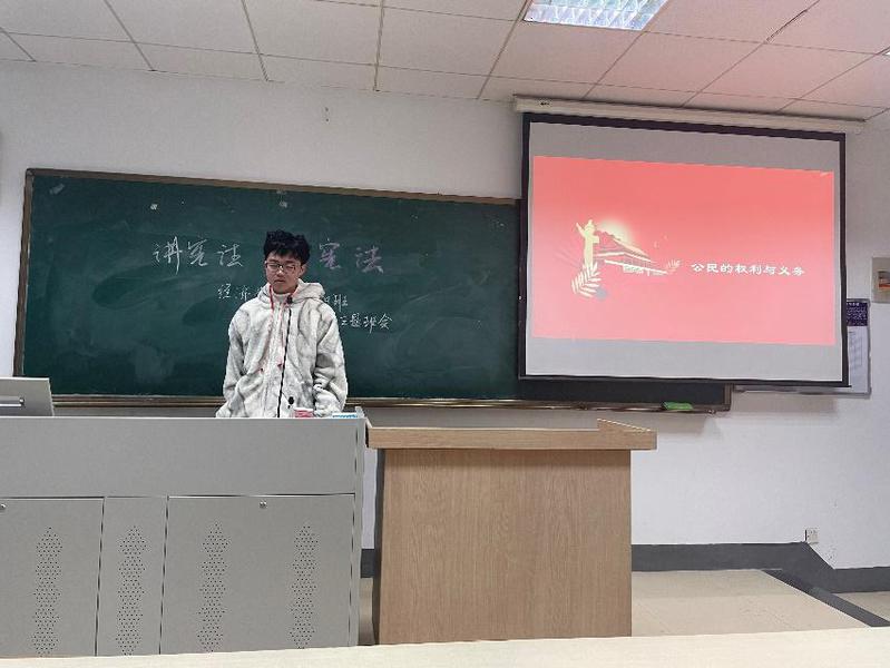 班会伊始,张润驰老师将宪法与大学生生活相联系,巧妙形象诠释了宪法的定义概念与价值意义。随后,冯韵同学从全国法制日概述、“六五普法要点”、宪法的地位与意义等多方面介绍了宪法。期间,周雨晖同学、张夏阳同学、卞简同学踊跃上台发言,通过PPT课件、主题演讲等形式为同学们介绍宪法,阐述自己对宪法的见解。最后冯韵同学号召同学们要把学习宪法与建设社会主义现代化强国的宏伟目标相结合,为中国特色社会主义事业的发展作贡献。
