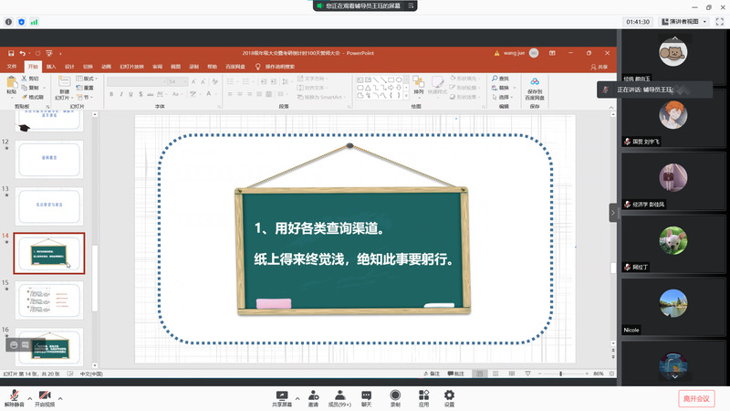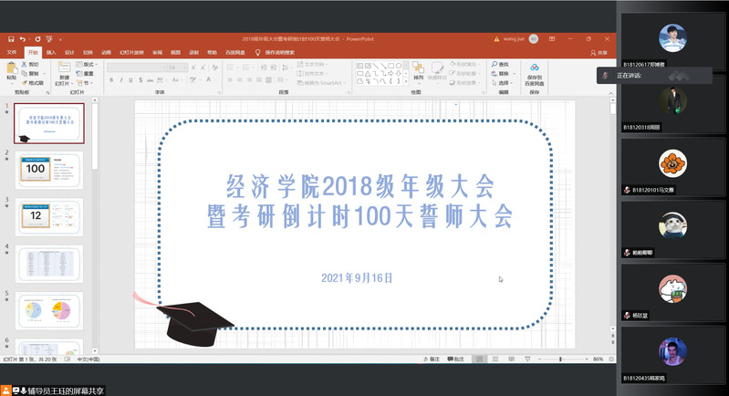 为了引导SJB官网大四学生坚定信心,进一步明确奋斗方向,2021年9月16日,SJB世俱杯官方网站2018级全体本科生在线上召开本学期第一次年级大会暨考研倒计时100天誓师大会。SJB官网党委副书记兼副院长董军、副院长王子敏、副院长杨小军受邀出席本次会议,会议由辅导员王珏主持,全体2018级学生参会。