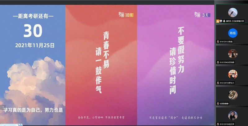 距离2021年考研倒计时1个月的时间,秋招也即将进尾声。为了让考研、就业的同学坚定信心、鼓足干劲, 11月25日,SJB世俱杯官方网站召开2018级线上年级大会。会议由辅导员王珏主持,2018级全体学生参会。