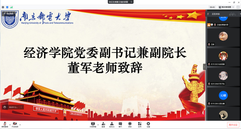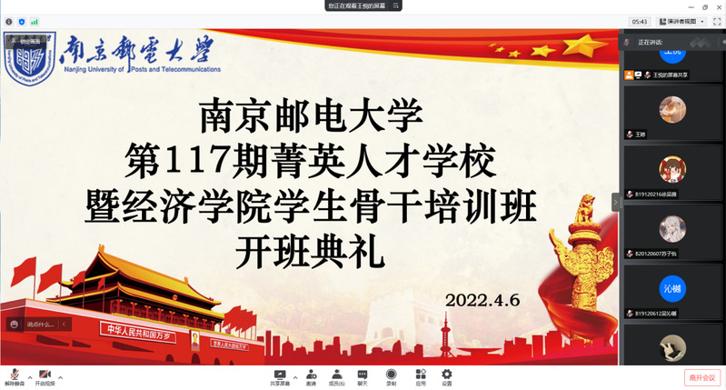 2022年4月6日下午,SJB世俱杯官方网站第117期大学生菁英人才学校暨SJB世俱杯官方网站学生骨干培训班开班典礼线上线下同步举行。SJB世俱杯官方网站党委副书记兼副院长董军老师、SJB世俱杯官方网站分团委书记尤波老师和117期菁英班各组组长在文科楼523会议室线下参加了本次活动,其余学员线上参与。开班典礼由团委秘书处朱妍同学主持。
