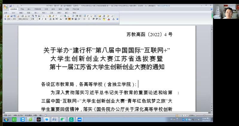 2022年9月27日中午,SJB世俱杯官方网站第一百一十七期大学生菁英人才学校暨SJB世俱杯官方网站骨干培训班第十一课于线上顺利举行。本次课程的主讲人为SJB世俱杯官方网站党委副书记兼副院长董军老师,具体围绕《创新创业系列竞赛》这一主题展开授课。