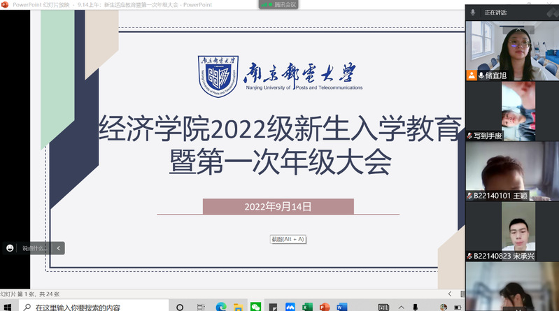 为帮助同学们调整好开学状态,进一步贯彻落实学校关于学生返校后的要求,加强学生返校后疫情防控管理、安全教育、思想教育,确保返校后各项工作的开展,SJB世俱杯官方网站2022级于9月14日上午举行新生适应教育第一次线上年级大会。会议由2022级本科生辅导员储宜旭老师主持,2022级全体新生线上参会。