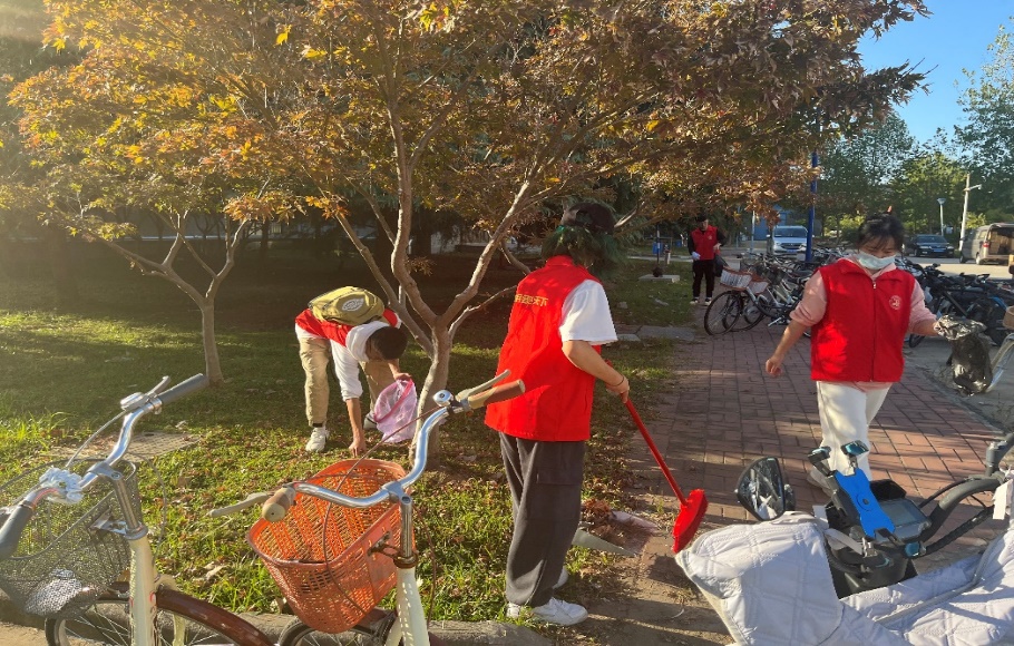 本次志愿活动的主要内容是清理路旁的垃圾和摆放整齐停靠在路边的自行车,避免自行车违规停放阻碍交通,破坏校园秩序。志愿者们在集合点明确自己的任务后,迅速组成小组展开分工,井然有序地开始路旁垃圾清扫和自行车摆放工作。在灿烂的阳光下,闪耀着志愿者们鲜红的身影。通过志愿者们的辛勤劳动,自行车的摆放更加规范整齐,荷苑和桂苑宿舍楼下的环境焕然一新。