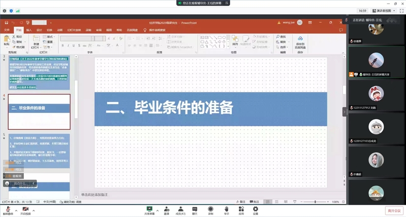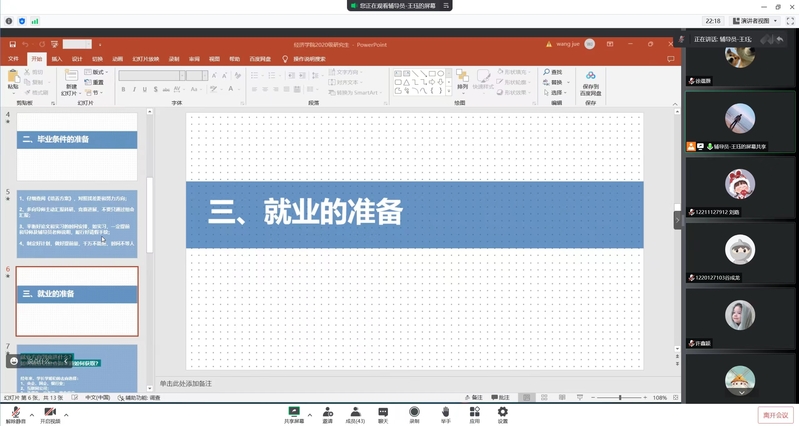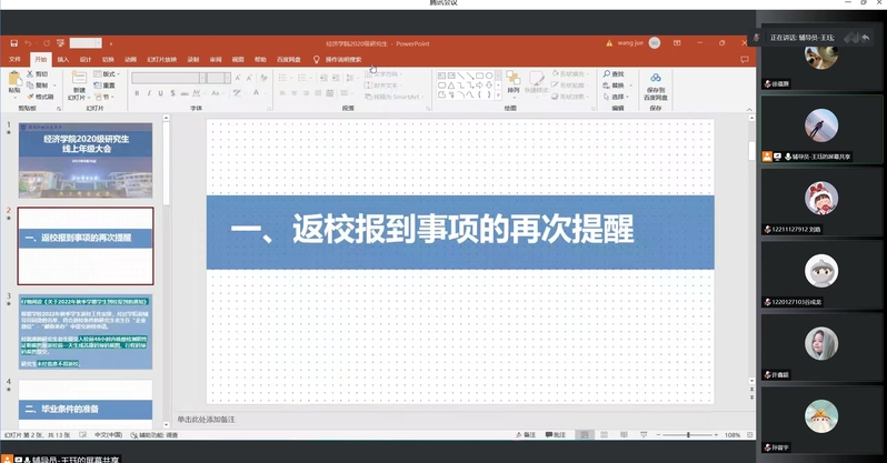 本次会议主要涉及三方面内容。首先,王老师对于新学期返校报到事项进行了再次强调,叮嘱同学们严格按照学校要求,提前准备好申请返校所需的各项材料,及时提交返校申请,严格遵守疫情防控各项规定和校纪校规,切勿擅自返校,守护好校园安全稳定。接着,王老师就毕业条件的各项准备,向全体研三学生做出了再次提醒。叮嘱研三同学要制定好学习生活计划,对照培养方案和毕业要求进行逐项核对,及时跟导师汇报各项学习科研进展,确保顺利达到毕业条件,安心就业。最后,王老师重点强调了就业的各项准备工作。从个人简历的撰写、招聘信息的查找、笔试面试的准备等多方面入手,为大家进行了详细介绍和经验传授,叮嘱同学们要早做准备,做全准备,及时进行网申和简历投递,珍惜每一次笔试面试的机会,不断总结和完善,尽早找到自己满意的工作。
