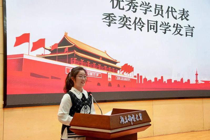 随后,优秀学员代表季奕伶同学上台发言,她代表第一百一十七期菁英班学员汇报了近一年来的学习成果和感想,并表示应以此为新的起点,在今后的学习生活工作中,以更高、更严格的标准来要求自己,不负学校、学院的嘱托与期望。
