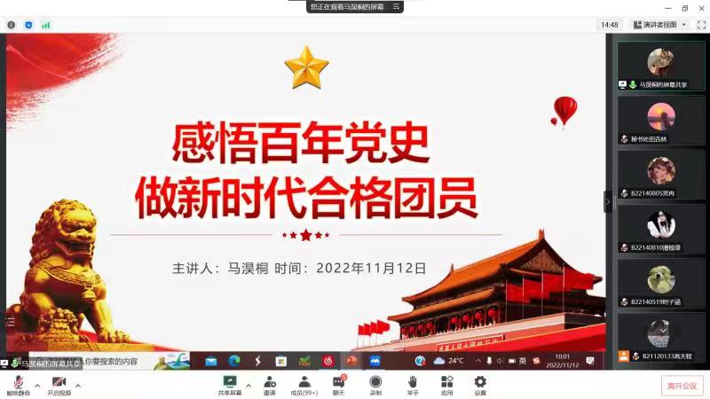 本次公开课中,马淏桐同学带领学员们回顾了我党波澜壮阔的百年历程,共同感悟不同历史阶段所铸就的伟大时代精神与红色传统。同时立足于当下,从历史进步和党国未来两个方面共同强调了新时代青年承担应负责任与使命的重要意义,指出我国广大青年应坚定信仰马克思主义,高举中国特色社会主义旗帜,不忘初心跟党走,牢固树立正确的政治选择和人生航向。课程最后,马淏桐同学勉励大家积极弘扬先辈精神,踔厉奋发于新时代,在个人前途与国家命运同频共振中书写新时代团员的无悔青春。