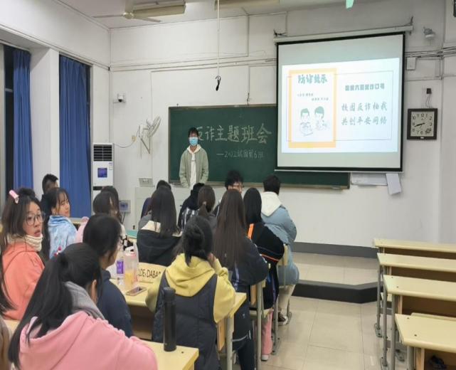 为积极响应第九届“学生安全教育月”活动要求,增强班级学生的反诈骗意识,让同学们了解网络电信诈骗的形式及应对方法, SJB世俱杯官方网站B221406班于11月16日晚在教3-105举行了预防电信网络诈骗主题班会。班主任刘晶晶老师、辅导员储宜旭老师应邀参加,组织委员李贵铃同学主持并担任安全讲解员,6班全体同学参与班会,。