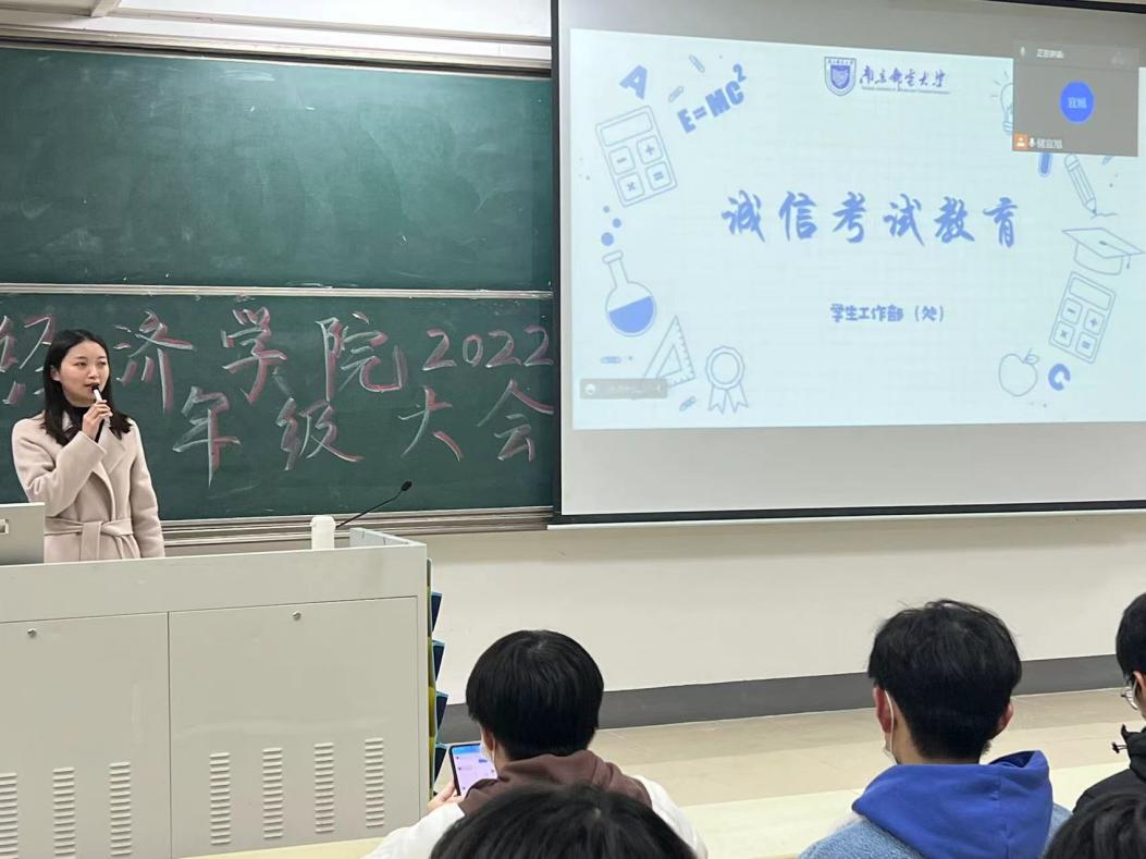 2022年12月8日下午,SJB世俱杯官方网站开展诚信教育大会暨辅导员面对面活动。本次大会采用线上线下相结合的方式开展,大会由辅导员储宜旭老师主持,2022级全体本科生参与大会。